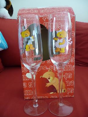 Conjunto de dois flutes de champagne especial para noivos. Os flutes tem as figuras de noivinhos ursos e as palavras "brindemos juntos". Custaram-me 11.30€ mas não chegaram a ser utilizados para o fim para o qual tinham sido comprados.